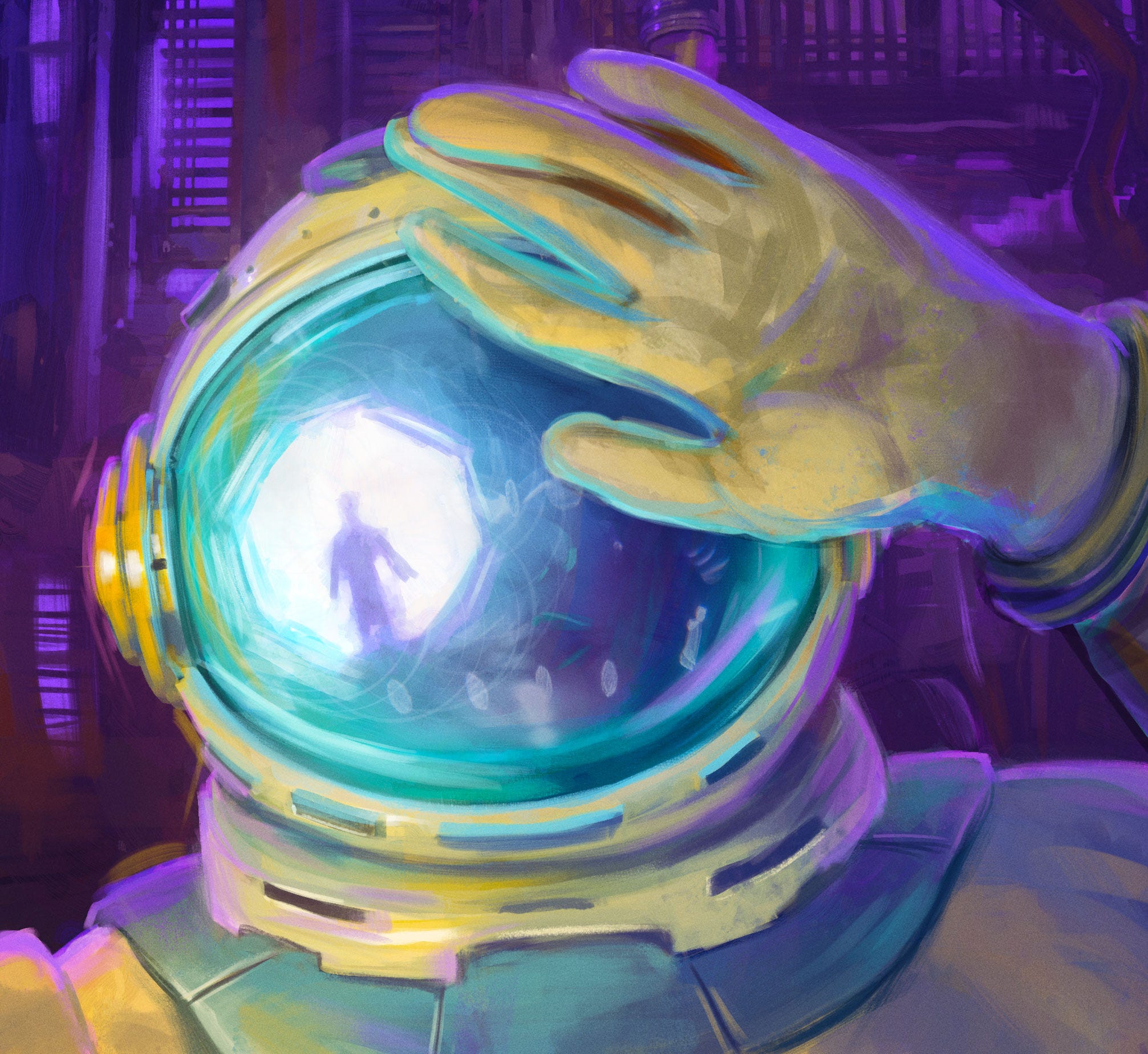 They went to rub their hand across their head with their gloved hand, but stopped as they hit the glass of their helmet. They smiled, showing a missing incisor.